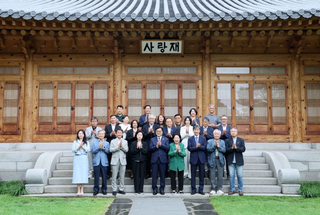 우원식 국회의장이 14일 국회 사랑재에서 홍범도장군기념사업회, 김좌진장군기념사업회, 우당이회영기념사업회 등 무장독립투쟁 선양단체를 초청해 오찬 간담회를 열고 기념사진 촬영을 하고 있다. 국회의장실