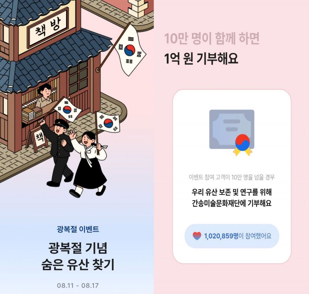 14일 금융권에 따르면 카카오뱅크는 광복절 기념 숨은 유산 찾기 이벤트를 지난 11일부터 진행하고 있다. 1945년 8월15일 광복을 맞은 날을 만화로 그린 그림에서 15초 이내에 제시된 5개 유산(사전·무궁화·청자·승탑·그림)을 찾으면 사례금을 주는 이벤트다. 광복절을 맞이해 문화유산 보존 문제를 환기하고자 하는 의도로 풀이된다.