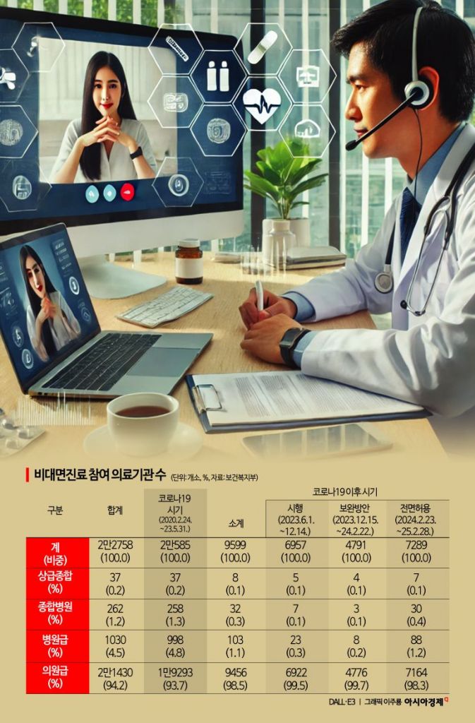 2020년 2월부터 올해 2월까지 5년간의 비대면진료 시범사업 기간 의료기관의 청구 자료를 분석한 결과, 한 번이라도 비대면진료를 한 의료기관은 2만2758곳이었다. 이 중 94.2%(2만1430곳)는 의원급이었다. 이어 병원급 의료기관 1030곳(4.5%), 종합병원 262곳(1.2%), 상급종합병원 37곳(0.2%) 등이 비대면진료에 참여, 병원 규모가 커질수록 비대면진료가 적었다.