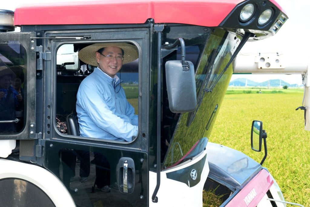 김영록 전라남도지사가 14일 조생벼 수확이 한창인 고흥군 포두면 들녘을 찾아 콤바인으로 벼 수확 시연을 하고 있다. 전남도 제공