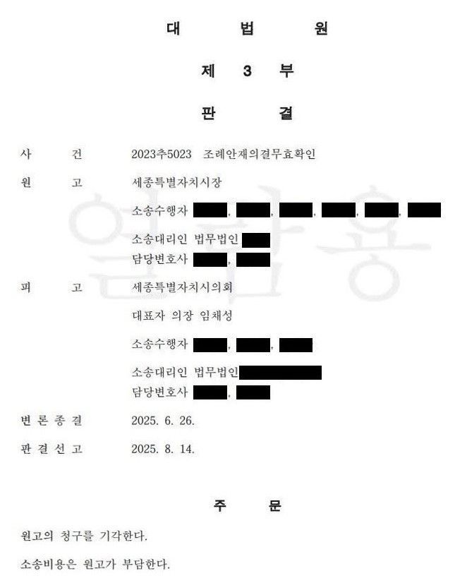 세종시 행정집행부와 지역 정치권이 시민 혈세로 파워게임을 벌였다는 시각이 제기돼 만감이 교차하는 허탈감이 나온다. 집행부와 의회 간 2년 넘게 소송이 진행돼 왔던 사실이 알려지면서 논란이 예상된다. 대화가 아닌 법적 분쟁으로까지 비화하는 방법으로 다퉈야 했는지에 의문이 제기된다.