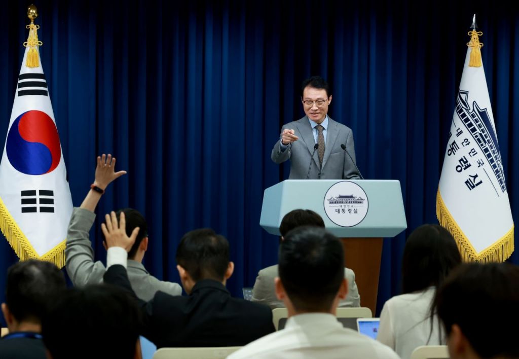 이규연 대통령실 홍보소통수석이 14일 서울 용산 대통령실 청사에서 이날 이재명 대통령 주재로 열린 수석·보좌관 회의 관련 브리핑 뒤 취재진 질문을 받고 있다. 연합뉴스