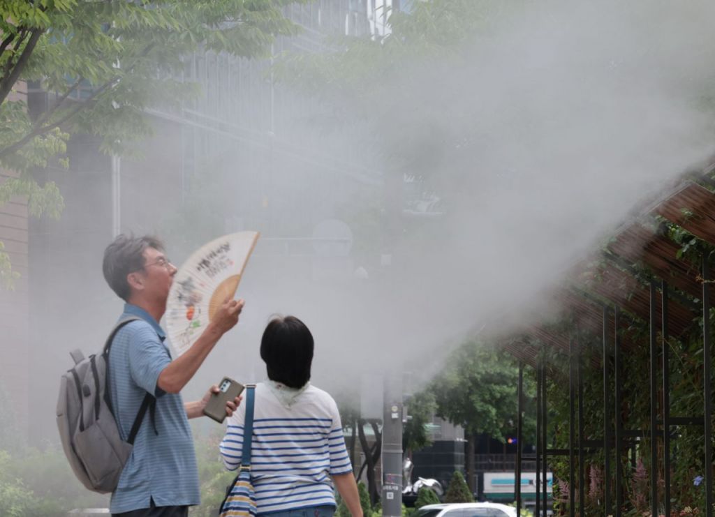 무더운 날씨 이어지면서 전국 대부분 지역에 폭염특보가 발효된 1일 서울광장에서 한 시민이 쿨링포그 앞에서 부채질을 하고 있다. 연합뉴스