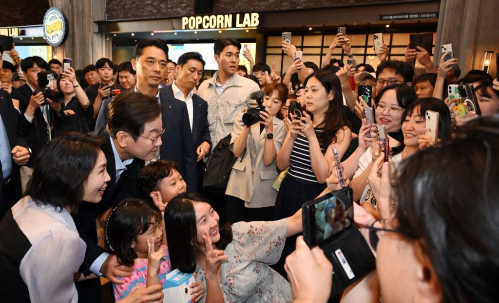 이재명 대통령이 17일 서울 용산CGV에서 '독립군:끝나지 않은 전쟁' 관람 후 시민들과 기념촬영을 하고 있다. 연합뉴스