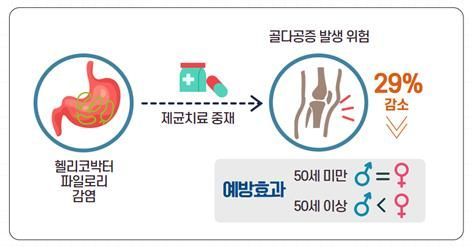 헬리코박터 파일로리 제균 치료가 골다공증 예방에 효과가 있으며, 특히 50세 이상 여성에서 효과가 뚜렷하다는 연구 결과가 나왔다.
