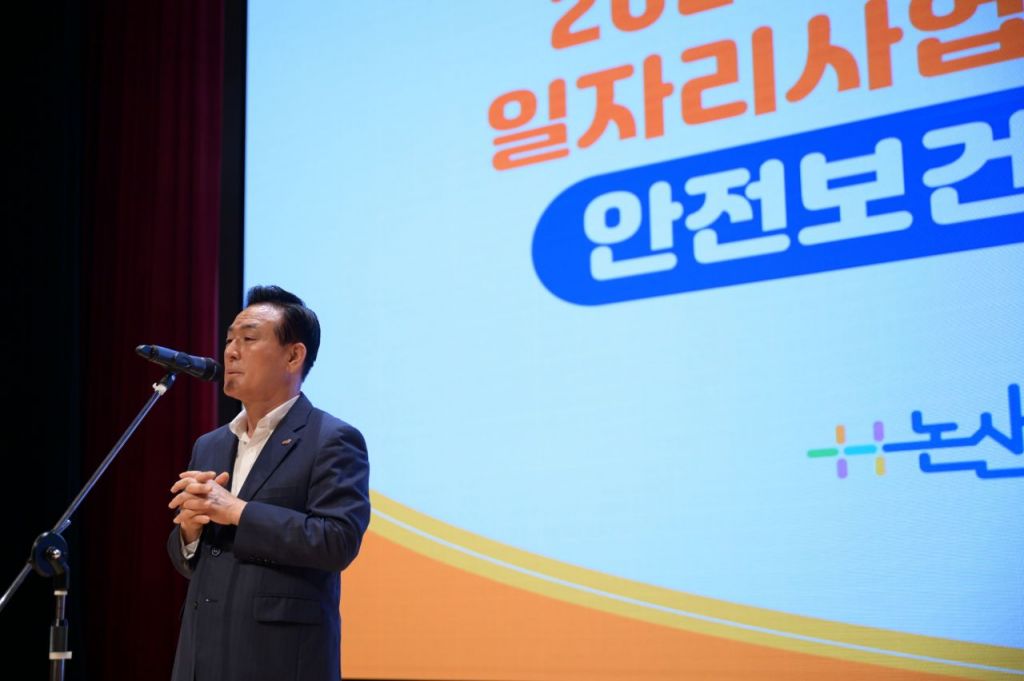 백성현 논산시장이 지난 14일 논산아트셍터에서 열린 하반기 일자리사업 참여자 안전교육에서 인사말을 하고있다./논산시청