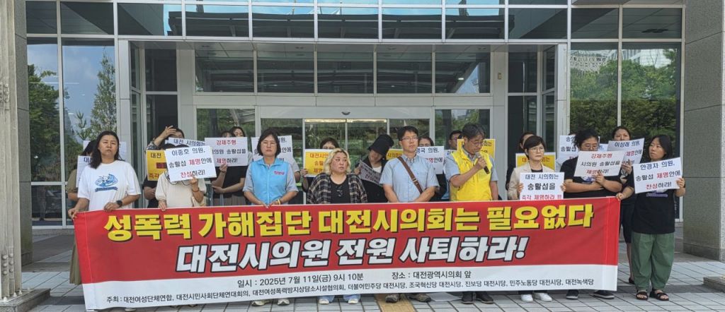 한편 대전여성단체연합과 대전시민사회단체연대회의 등 시민단체가 18일 오전 대전시의회 앞에서 송활섭 대전시의원의 '성추행 혐의' 제명안 부결과 관련 '성폭력 가해 집단 대전시의회는 필요 없다. 대전시의원 전원 사퇴하라'며 기자회견을 개최했다.