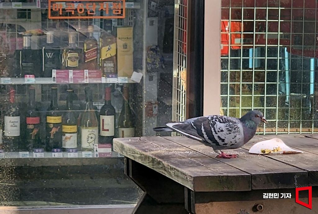비둘기가 편의점 앞에서 누군가 놓아둔 견과류를 열심히 먹고 있다. 이건 인간들이 안주라 부르는 음식이다. 술병 앞이다 보니 더욱 그런 생각이 든다. (서울 마곡동)