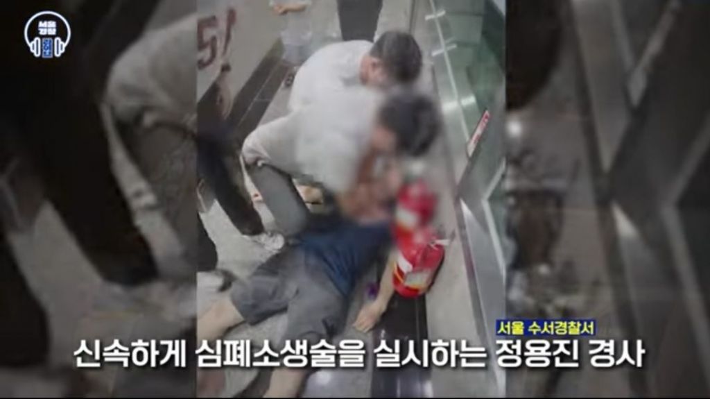 지난달 24일 서울 수서경찰서 정용진 경사가 쓰러진 시민에게 심폐소생술을 하고 있다. 유튜브 채널 '서울경찰' 캡처