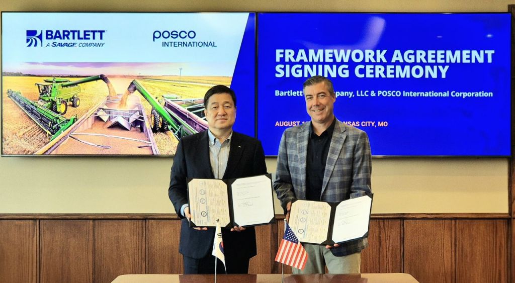 포스코인터내셔널이 18일(현지시간) 미국 캔자스 시티에서 미국 곡물기업 바틀렛앤컴퍼니(Bartlett and Company)와 업무협약을 체결했다. 2027년까지 연간 400만t 규모로 곡물 거래를 확대해 회사의 성장은 물론 우리나라 식량 안보에도 기여한다는 방침이다.