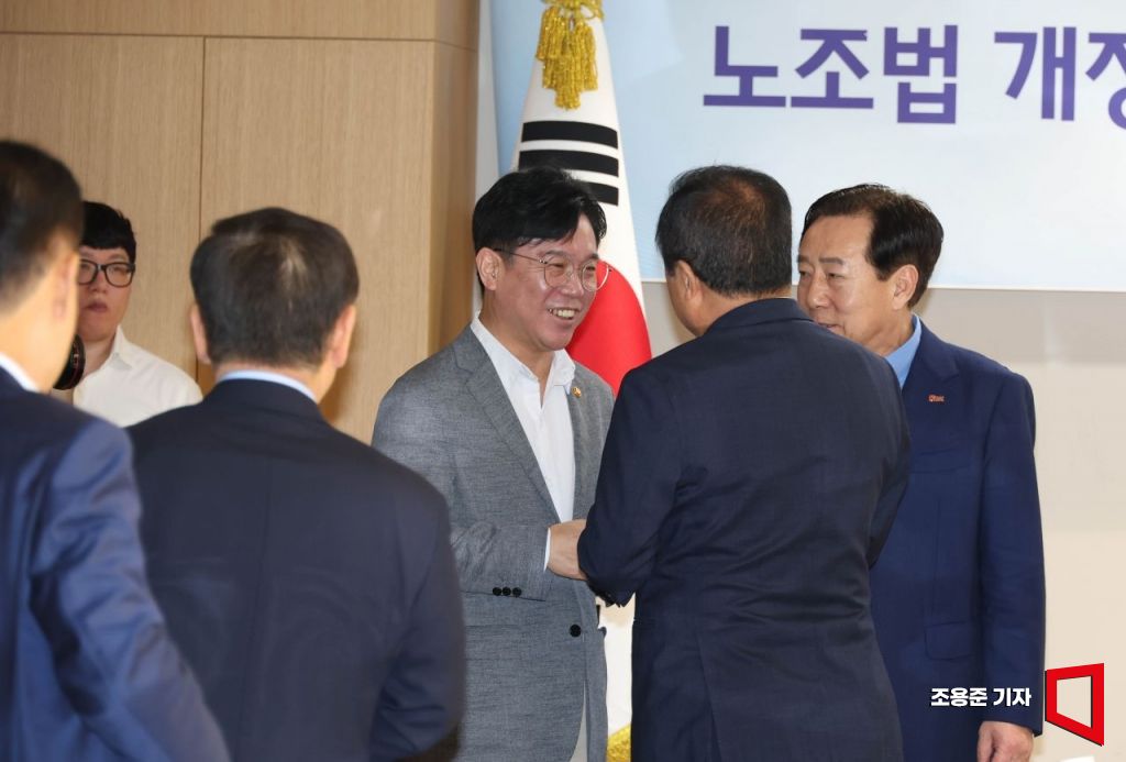 김영훈 고용노동부 장관이 19일 서울 여의도 중소기업중앙회에서 열린 노조법 개정 관련 중소기업인 간담회에 참석, 기업인들과 인사를 나누고 있다. 이날 김장관은 취임후 경제단체방문 첫 일정으로 중소기업중앙회를 방문했다.