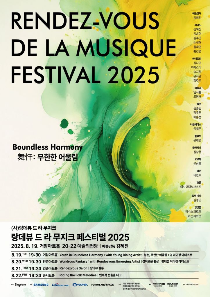 올해 랑데뷰 드 라 무지크 페스티벌은 4회째를 맞아 'Boundless Harmony: 무한한 어울림' 라는 주제로 오는 22일까지 예술의전당 인춘아트홀(2회)과 콘서트홀, 서울 강남구 신사동 거암아트홀에서 모두 4회 공연을 선보인다.