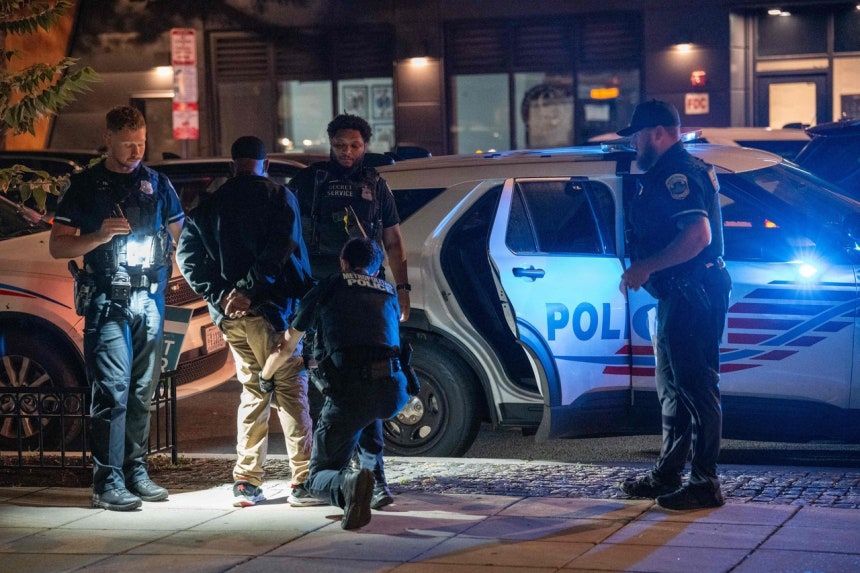 FBI, 비밀경호국, 국토안보수사국, 워싱턴 메트로폴리탄 경찰국(MPD) 소속 요원들이 워싱턴 DC 쇼(Shaw) 지역에서 한 남성을 체포하고 있다. AFP 연합뉴스