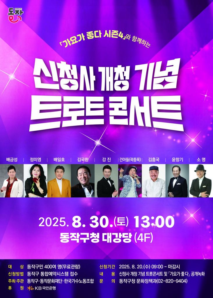 이번 행사는 45년 만의 신청사 이전을 구민과 함께 축하하고, 세대가 함께 즐길 수 있는 문화 향유 기회를 제공하고자 마련됐다. 동작구와 동작문화재단, 한국방송가수노동조합이 공동 주관하며, 트로트 전문 방송 프로그램 ‘가요가 좋다 시즌 4’의 공개 녹화와 연계해 진행된다.