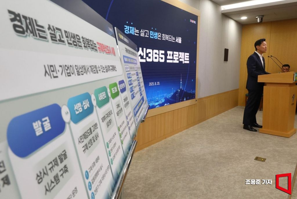 오세훈 서울시장이 20일 서울 중구 서울시청 브리핑룸에서 '규제혁신 365 프로젝트' 관련 기자설명회를 하고 있다.