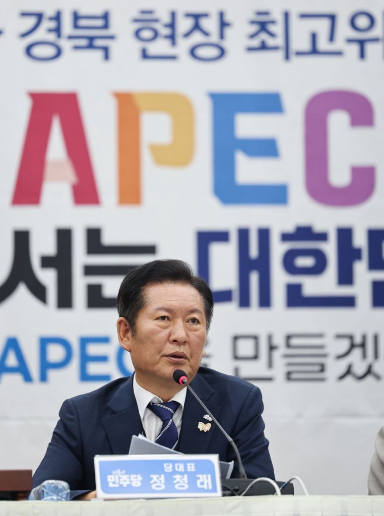정청래 더불어민주당 대표는 20일 "아시아태평양경제협력체(APEC) 정상회의 성공을 계기로 대한민국의 외교 역량이 확장되고 수출이 잘 돼서 한국 경제의 도약대가 되길 간절히 바란다"고 밝혔다.