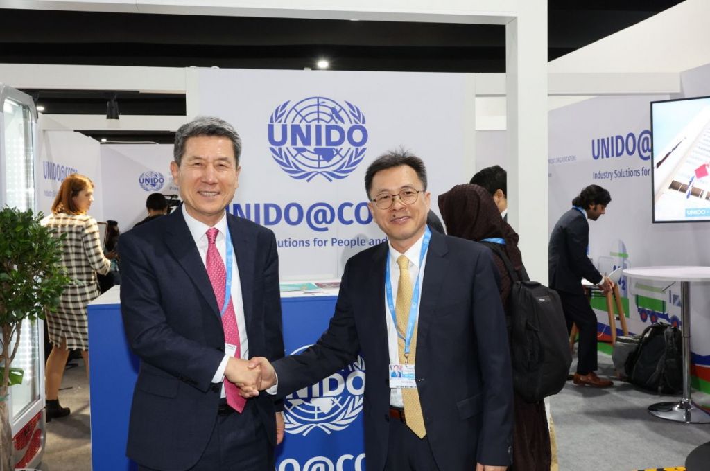 지난해 11월 아제르바이잔 바쿠에서 개최된 ‘제29차 유엔기후변화협약 당사국총회(COP29)’ 참석해 포항을 유니도에 소개했다. 이강덕 포항시장, 츠용 조우 유니도 부국장(오른쪽)