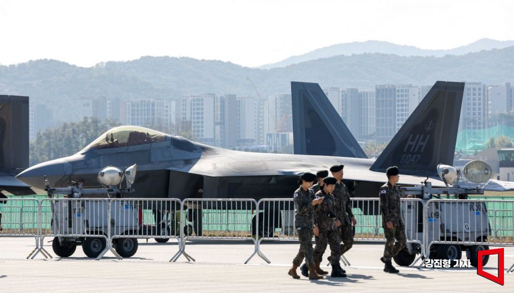 17일 경기 성남 서울공항에서 열린 '서울 국제 항공우주-방위산업 전시회(ADEX) 2023'에서 미 공군 F-22 랩터가 공개되고 있다. 사진=강진형 기자aymsdream@