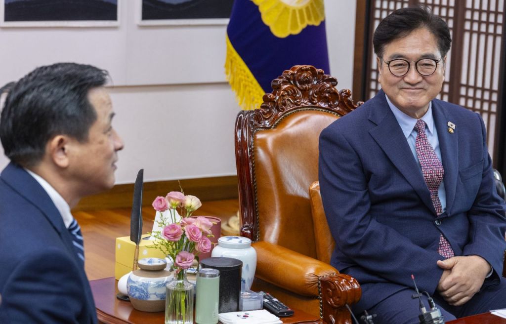 우원식 국회의장(오른쪽)이 20일 국회에서 다이빙 주한중국대사를 면담하기 전 악수하고 있다. 연합뉴스