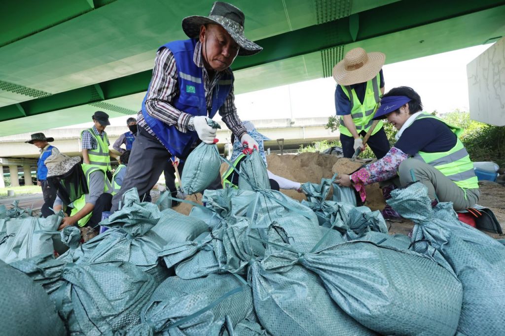 지난 5일 오전 광주 북구 동림동 산동교친수공원 주차장에서 작업자들이 침수 예방에 사용할 모래주머니를 만들고 있다. 연합뉴스
