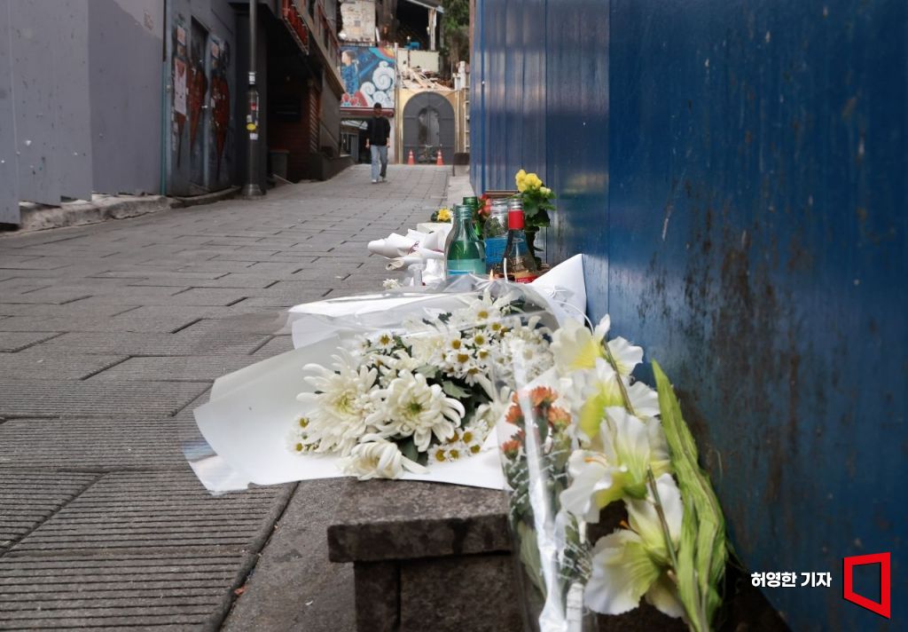 이태원 헬로윈 참사 2주기인 2024년 10월29일 서울 이태원 사고현장 골목길에 추모 꽃다발들이 놓여 있다.