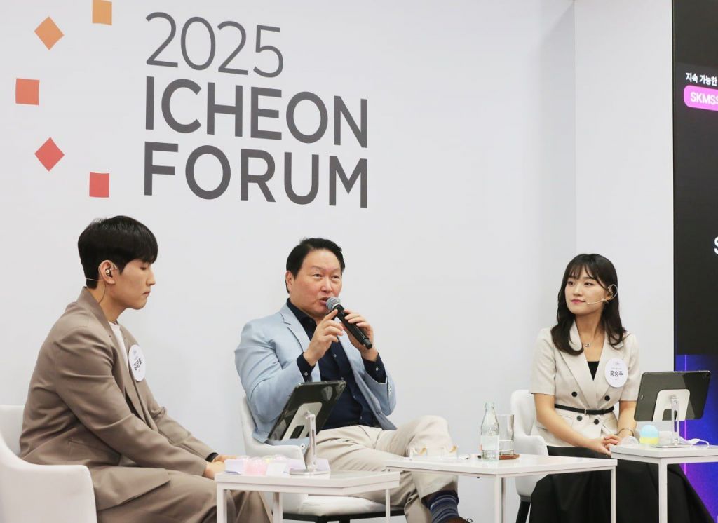 최태원 SK그룹 회장이 20일 서울 종로구 SK서린빌딩에서 열린 '이천포럼 2025' 폐막 세션에서 구성원들의 질문에 답하고 있다. SK