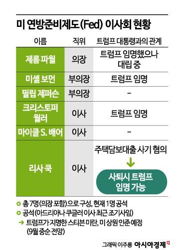 이런 가운데 민주당 성향의 쿡 이사가 사퇴할 경우 트럼프 대통령의 Fed 장악력이 더 커질 것이란 관측이 나온다. 쿡 이사는 버락 오바마 전 대통령 시절 경제자문위원회 위원으로 재직했으며, 전임인 조 바이든 대통령이 Fed 이사로 임명했다. 최초의 흑인 여성 Fed 이사로, 임기는 2038년까지다. 쿡 이사는 미국의 기준금리를 결정하는 FOMC에 당연직으로 참여한다. 이 때문에 쿡 이사에 대한 FHFA의 조사와 트럼프 대통령의 사퇴 촉구는 단순한 개인 문제를 넘어 Fed를 겨냥한 압박으로 해석된다는 분석도 나온다.