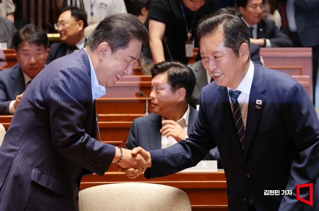 정청래 더불어민주당 대표와 김병기 원내대표가 21일 국회에서 열린 의원총회에서 악수하고 있다.