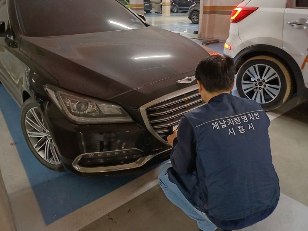 시흥시 관계자가 한 아파트 단지 내 주차장에서 체납 차량을 단속하고 있다. 시흥시 제공