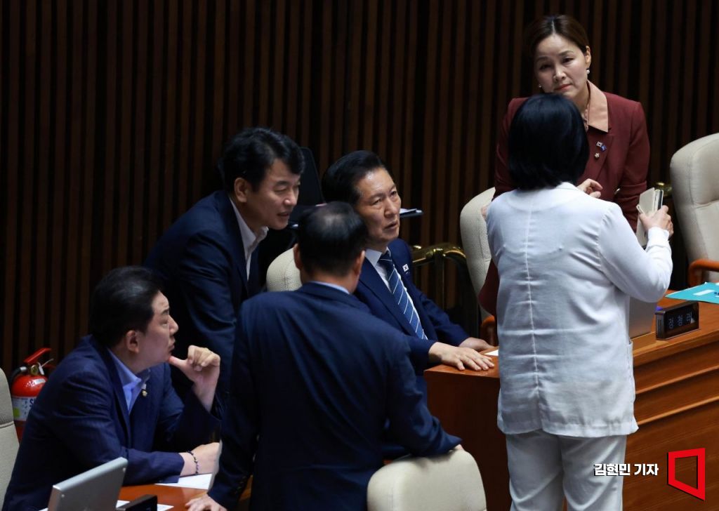 정청래 더불어민주당 대표와 김병기 원내대표 등 지도부가 21일 국회 본회의에서 대화하고 있다.