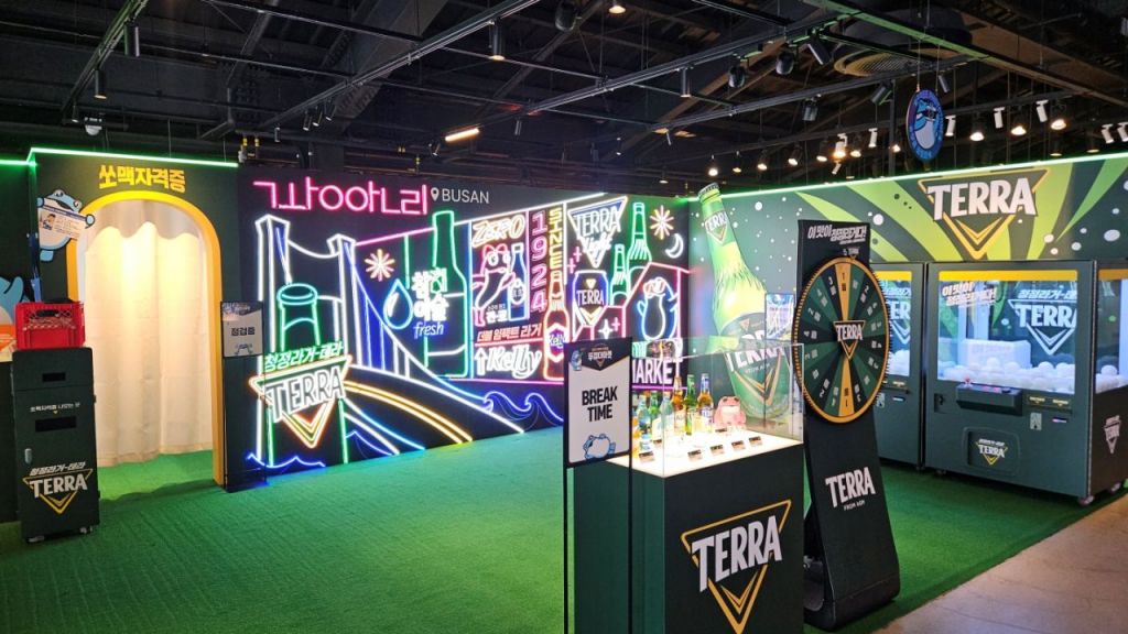 부산 밀락더마켓 2층에 ‘테라’ 브랜드 체험 공간 ‘두껍더마켓’을 마련해 네온 포토존, 쏘맥자격증체험존, 경품 이벤트 등을 다음달 30일까지 운영한다. [사진=하이트진로]