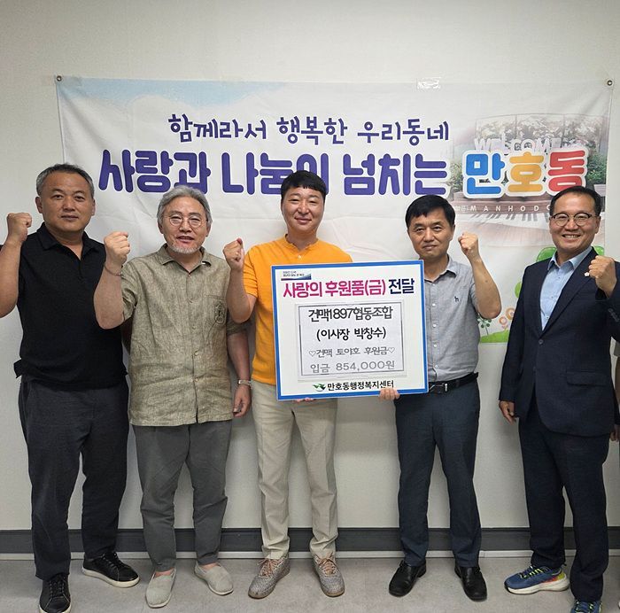 건맥1897협동조합는 지난 19일 만호동행정복지센터를 방문해 '토야호(土夜好) 축제' 경매 행사에서 모금한 후원금 85만4,000원을 기탁했다. 이 성금은 저소득 취약계층을 위해 사용될 예정이며, 특히 추석 명절을 앞두고 생활에 어려움을 겪는 가정에 전달돼 의미를 더한다.