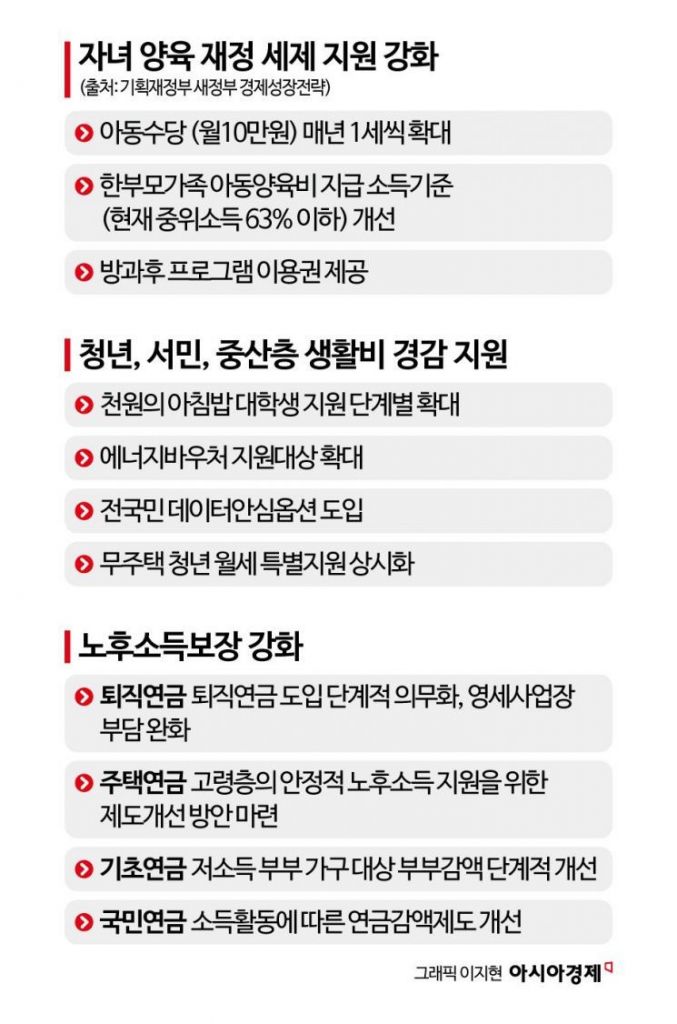 정부가 노후소득 보장을 강화하기 위해 퇴직연금제도 도입을 단계적으로 의무화한다. 청년의 주거 안정을 지원하기 위해 월세 지원사업은 상시 사업으로 전환한다. 저출산 시대 자녀 양육 부담을 완화해 주기 위해 방과 후 프로그램 이용권 제공을 지원해 교육비 부담을 완화하고, 아동수당 지급 대상은 매년 1세씩 확대한다.
