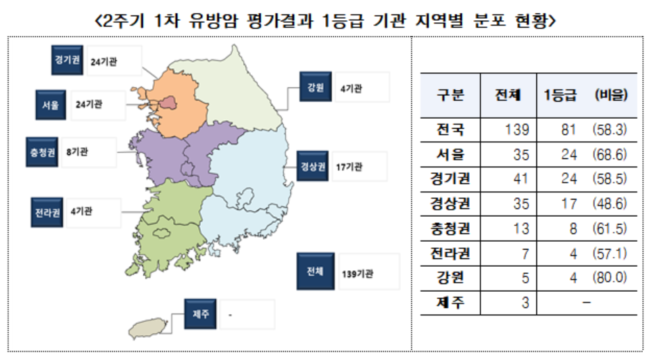국내 유방암 진료 병원 10곳 중 6곳가량이 1등급 평가를 받은 것으로 나타났다. 유방암 진료 1등급 병원은 다른 의료 여건과 비슷하게 서울과 경기에 절반 이상이 몰려 있었다.