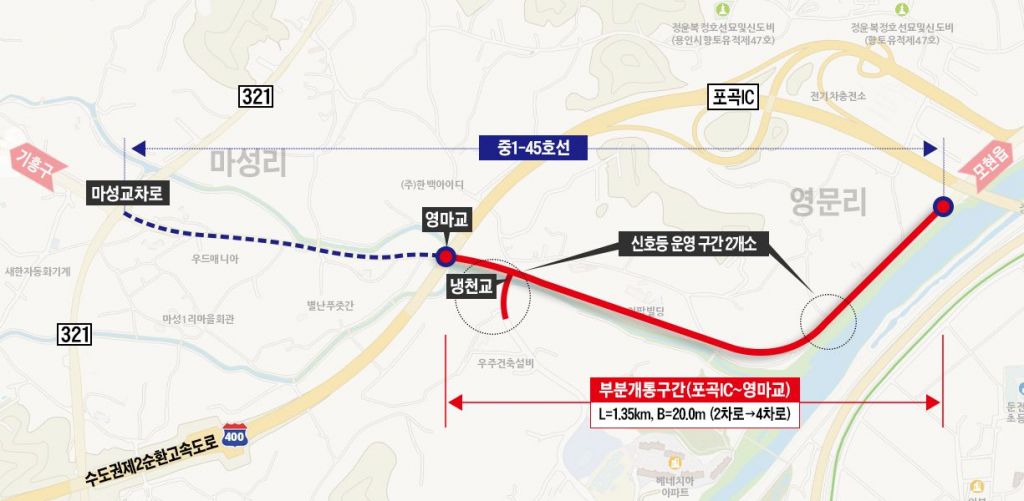 이 사업은 지역 내 주요 간선도로 접근성을 높이기 위해 수도권 제2순환고속도로 포곡IC와 지방도 321호선 마성1교차로 간 총 2.24㎞ 구간을 기존 2차로에서 4차로로 확장하는 것이다. 사업에는 총 345억원이 투입된다.