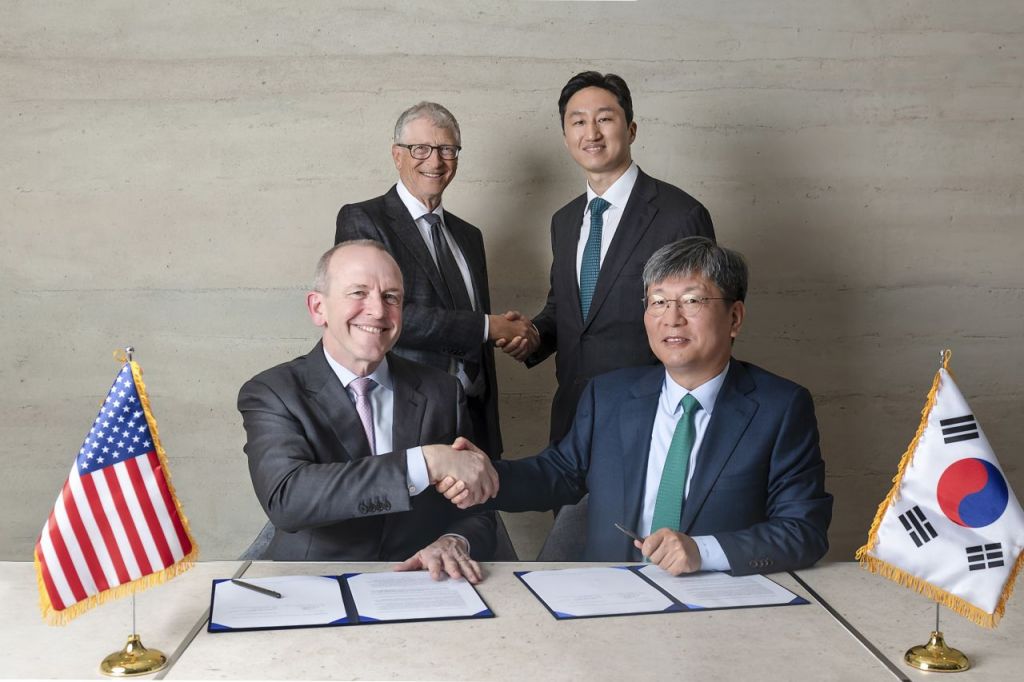 HD현대는 지난 3월 테라파워와 ‘나트륨 원자로의 상업화를 위한 제조 공급망 확장 전략적 협약’을 체결했다. 사진 오른쪽부터 원광식 HD현대중공업 해양에너지사업본부장, 정기선 HD현대 수석부회장, 빌 게이츠 테라파워 창업자, 크리스 르베크 최고경영자. HD현대 제공