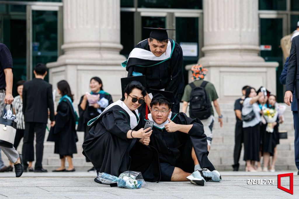 22일 서울 동대문구 한국외국어대학교에서 열린 '2025년 후기 학위수여식'에 외국인 졸업생들이 기념사진촬영을 하고 있다.