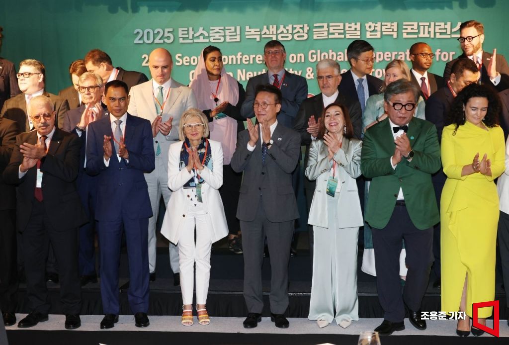 김민석 국무총리를 비롯한 내빈들이 22일 서울 종로구 포시즌스호텔에서 열린 탄소중립 글로벌 협력 컨퍼런스에 참석, 기념촬영을 하고 있다.