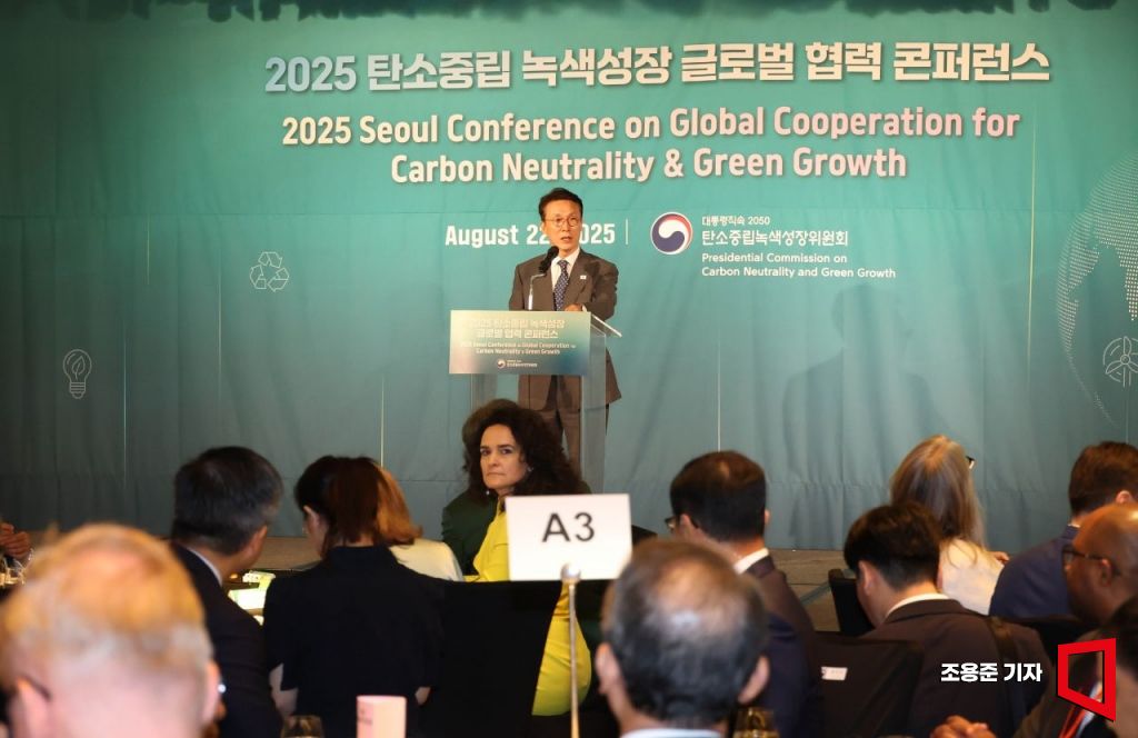 김민석 국무총리가 22일 서울 종로구 포시즌스호텔에서 열린 탄소중립 글로벌 협력 컨퍼런스에 참석, 개회사를 하고 있다.