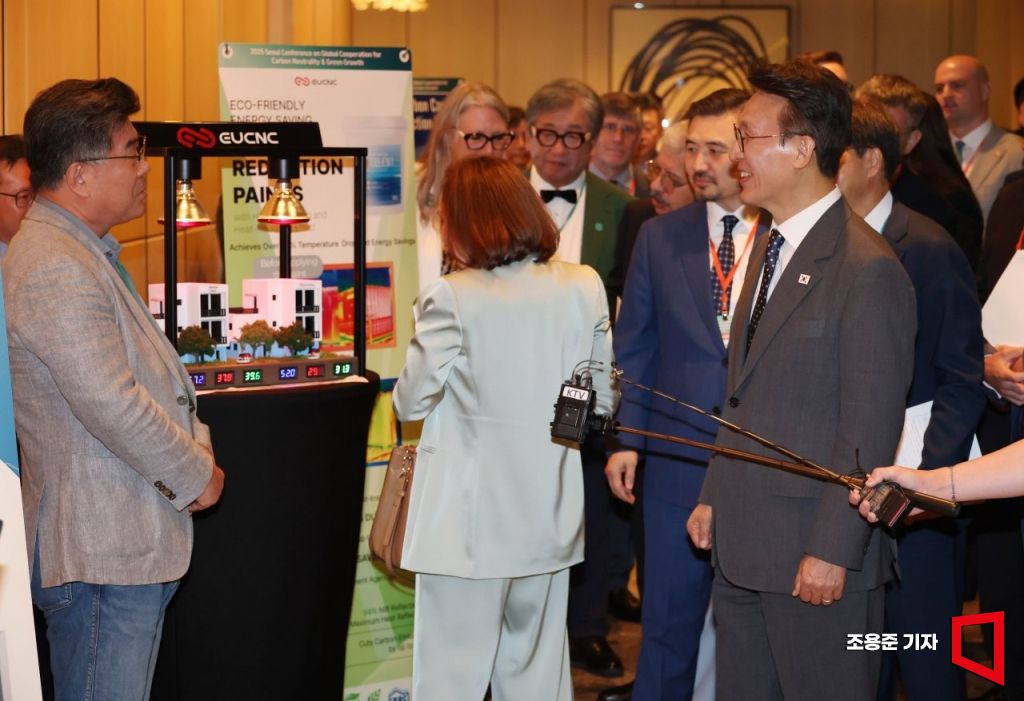 김민석 국무총리가 22일 서울 종로구 포시즌스호텔에서 열린 탄소중립 글로벌 협력 컨퍼런스에 참석해 기후테크기업 기업부스를 둘러보고 있다.