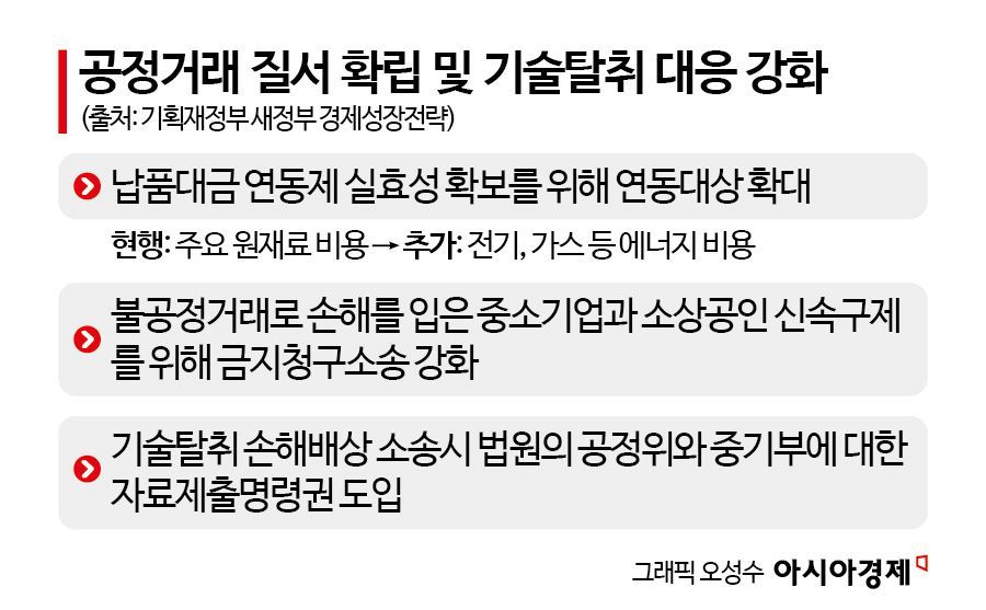 중소기업을 살리는 정책도 경제성장전략에 담겼다. 정부는 대·중소기업 불공정 거래를 시정하기 위해 공정위와 중기부에 대한 자료 제출명령권을 하반기 도입한다. 기술 탈취 손해배상 소송을 할 때 법원이 요구하면 두 기관이 가해 기업 자료를 제출하도록 한다. 피고 측이 영업 비밀을 이유로 두 기관에 비공개를 요구, 취득한 자료를 활용하기 어려운 문제를 개선하는 데 목적이 있다.