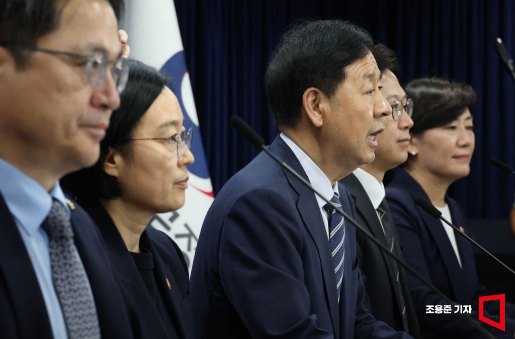 구윤철 경제부총리 겸 기획재정부 장관이 22일 서울 종로구 정부서울청사에서 새정부 경제성장전략 관련 관계부처 합동 브리핑을 하고 있다. 이날 브리핑에는 배경훈 과학기술정보통신부 장관, 송미령 농림축산식품부 장관, 한성숙 중소벤처기업부 장관, 문신학 산업통상자원부 1차관이 참석했다.