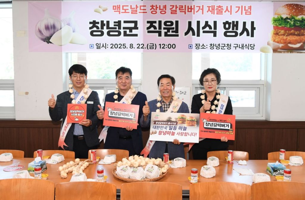 경남 창녕군은 지난 11일 대표 지역 특산물인 창녕마늘을 활용한 '창녕 갈릭 버거'가 전국 맥도날드 매장에서 재출시됨을 기념해, 군청 구내식당에서 400여 명의 직원들과 함께 22일 시식 행사를 개최했다.