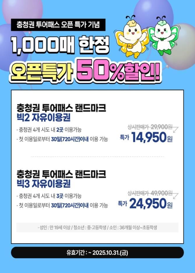 충청광역연합은 충청권 대표 관광상품 '충청권투어패스'의 출시를 기념해, 랜드마크 자유이용권을 기존 판매가의 절반 가격으로 제공한다.