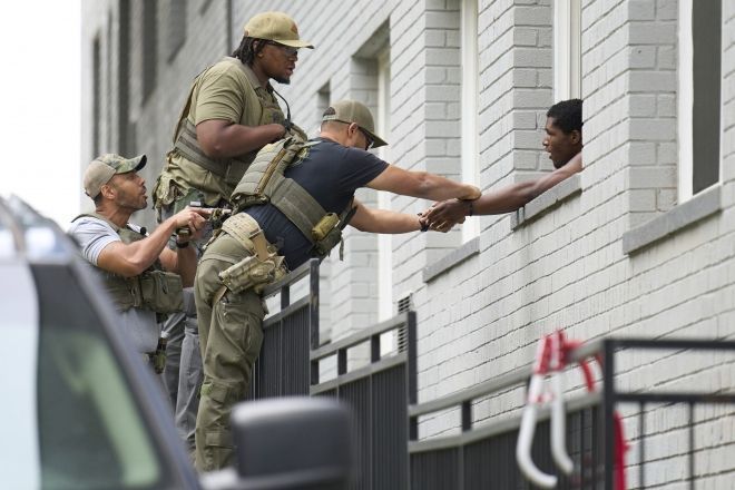 도널드 트럼프 미국 행정부의 이민 단속이 갈수록 강화되는 가운데 19일(현지시간) 워싱턴DC 북서부 펫워스 지역의 한 아파트 단지에서 무장 경관들이 아파트 창문 밖으로 손을 내민 흑인 남성에게 수갑을 채우고 있다. AP연합뉴스