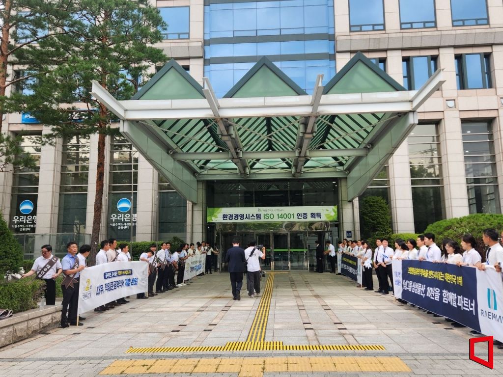 개폭우성7차 재건축 조합은 23일 서울주택도시개발공사에서 시공사 선정 투표 안건 등을 다루는 정기총회를 개최했다. 양사 직원들이 조합원들에게 한 표를 호소하며 인사하고 있다.