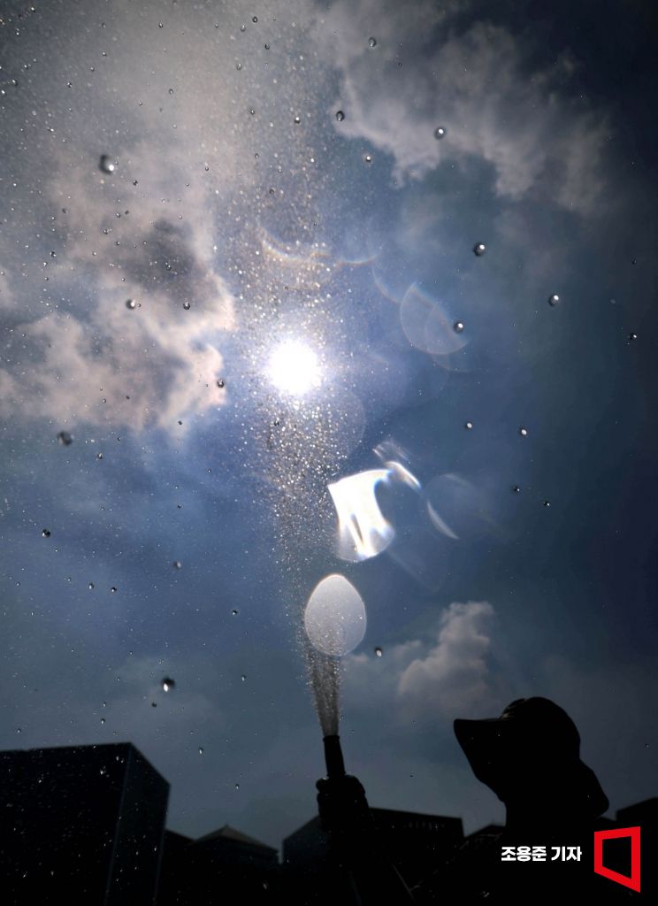 서울 종로구 광화문광장 관리직원이 잔디밭에 물을 뿌리고 있다. 조용준 기자