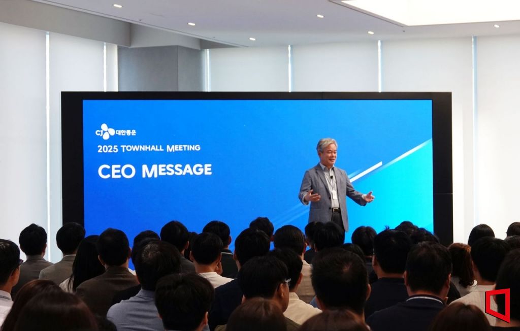 신영수 CJ대한통운 대표가 22일 서울 종로 본사에서 열린 임직원 대상 2025 타운홀 미팅에서 발표하고 있다. CJ대한통운