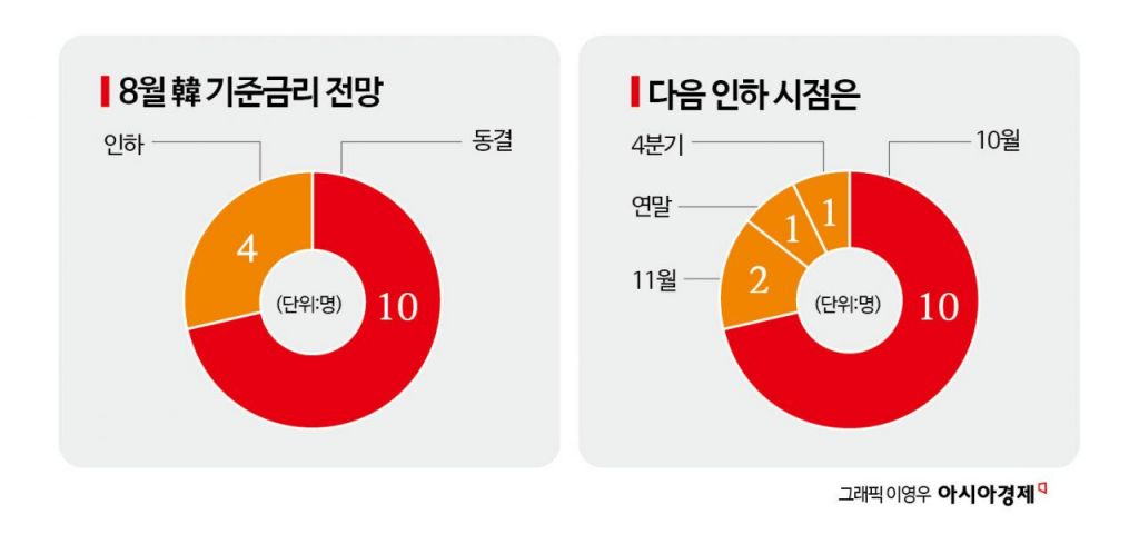 다음 기준금리 인하 시점은 10월이 될 것이란 전망이 10명(71.4%)으로 가장 많았다. 11월(2명), 연말(1명) 전망도 일부 존재했다. 부동산 가격 등 금융안정 기조를 확인하는 가운데 국내 경기 상황, 9월 금리 인하 재개 가능성이 높은 미국 상황까지 고려하면 10월 인하가 적절하다는 판단이다.
