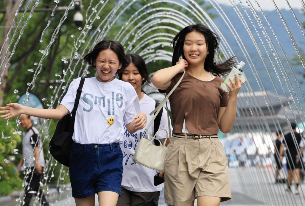폭염이 이어진 24일 서울 광화문 광장에서 시민들이 분수 터널을 지나며 즐거워하고 있다. 연합뉴스